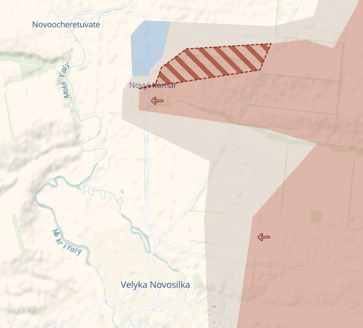Так, лейтенант ЗСУ з позивним "Алекс" пише, що в Новому Комарі на північ від Великої Новосілки йде бій, на південь – у районі Благодатного – росіяни "мають просування". За картою Deep State, минулої доби росіяни збільшили зону присутності навколо Нового Комара.