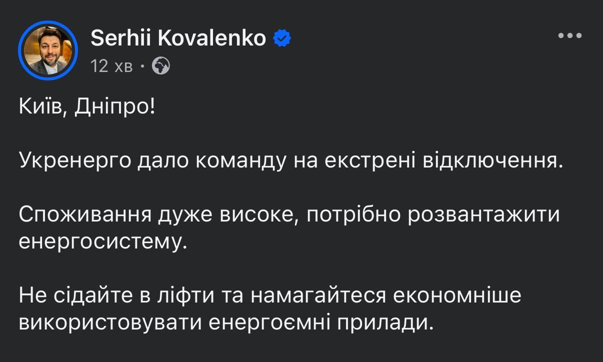 Генеральний директор Yasno Сергій Коваленко пише, що причина запровадження аварійних відключень по Україні – високе споживання.