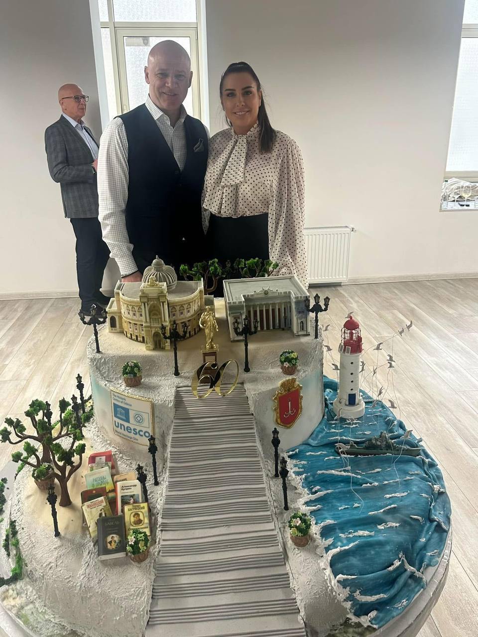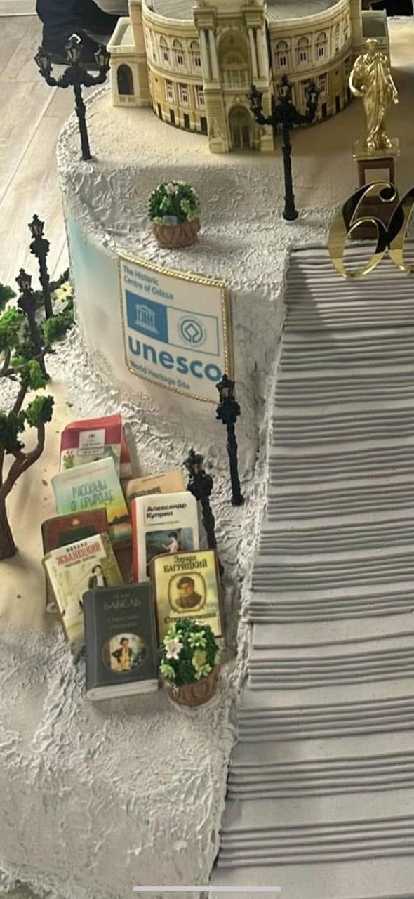 Також на торті видно логотип ЮНЕСКО. Центр Одеси знаходиться під охороною цієї організації, оскільки знаходиться в списку об'єктів всесвітньої спадщини.