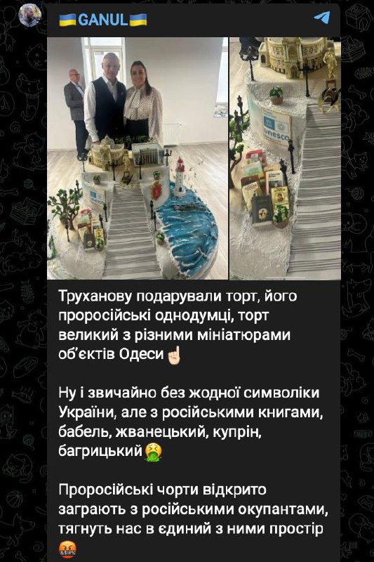 Меру Одеси Геннадію Труханову на ювілей подарували торт, декорований книгами відомих одеситів, які писали російською мовою – Бабеля, Жванецького, Багрицького та інших.