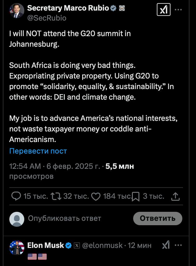 "Південна Африка робить дуже погані речі. Експропріює приватну власність. Використовує G20 для просування "солідарності, рівності та стійкості". Іншими словами: DEI і зміна клімату. Моя робота - просувати національні інтереси Америки, а не витрачати гроші платникам податків або потурати антиамериканізм", - написав Рубіо.