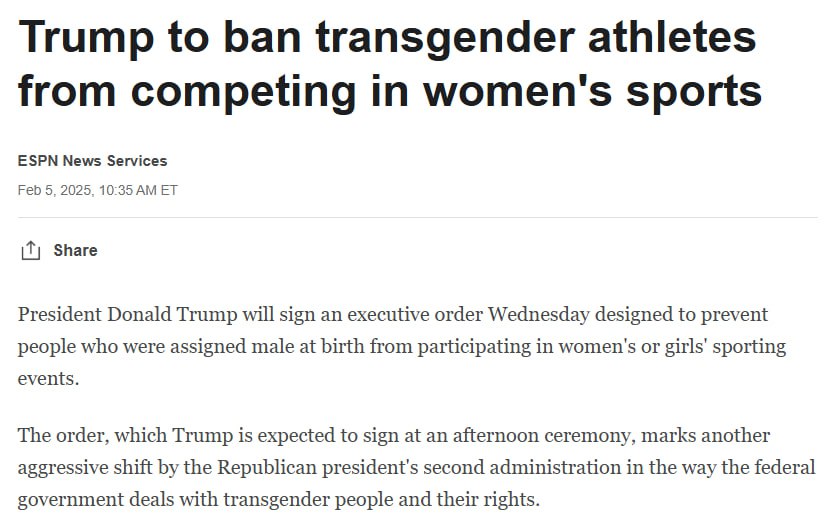 Також видання ESPN пише, що Трамп заборонить трансгендерам брати участь у спортивних змаганнях для жінок.