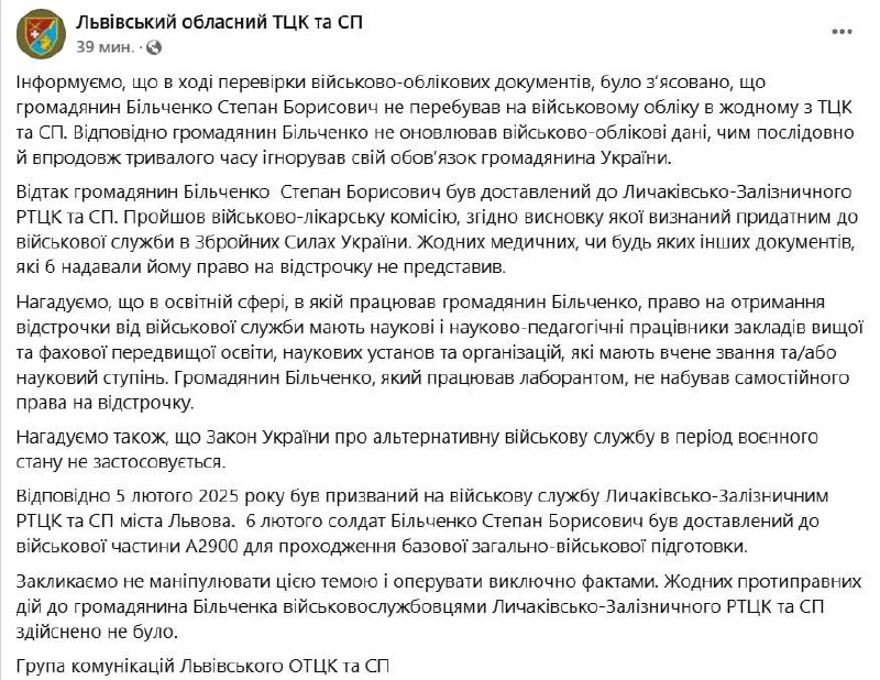 "6 лютого солдата Більченка Степана Борисовича було доставлено у військову частину А2900 для проходження базової військової підготовки. Жодних протиправних дій до громадянина Більченка військовослужбовцями Личаківсько-Залізничного РТЦК і СП не було", - йдеться в повідомленні.