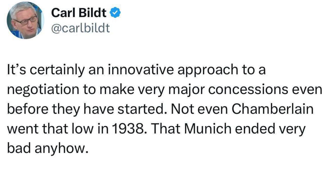 Колишній прем'єр Швеції Карл Більдт порівняв дії Трампа та Хегсета з "Мюнхенською змовою", заявивши, що "навіть Чемберлен у 1938 році не опускався так низько".