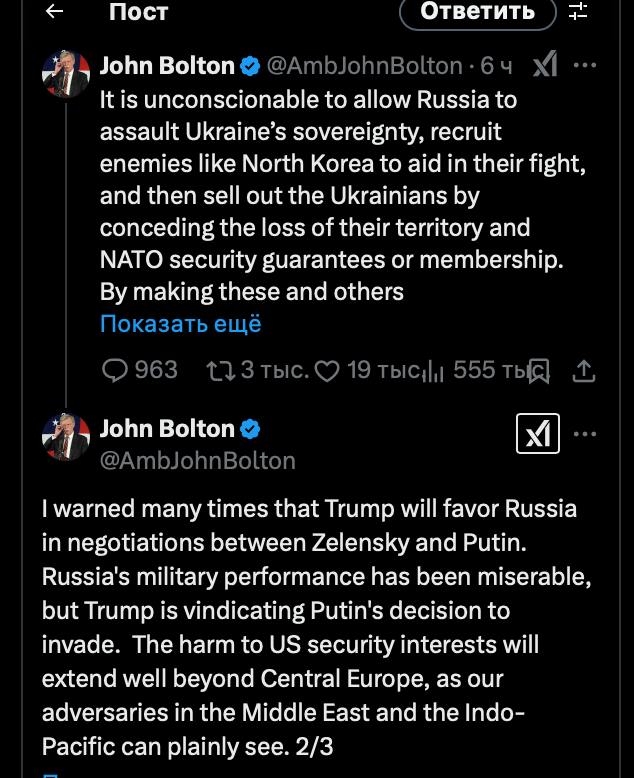 "У мене більше немає жодних очікувань, я думаю ми точно знаємо, що станеться. Президент Трамп фактично здався Путіну ще до початку переговорів. Позиції, які міністр оборони Хегсет оголосив у Брюсселі, я був би приголомшений, якби Трамп не передав їх безпосередньо Путіну в їхній телефонній розмові, є умовами врегулювання, які могли бути написані в Кремлі. Можливо, вони були написані в Кремлі і потрапили пропагандистськими каналами", - заявив Болтон.