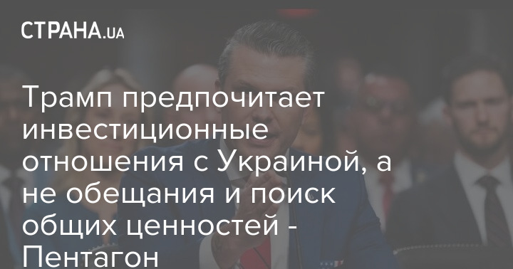 "Президент Трамп як переговорник і бізнесмен визнає, що інвестиційні відносини з Україною в кінцевому підсумку в довгостроковій перспективі для Сполучених Штатів набагато більш відчутні, ніж будь-які обіцянки або спільні цінності, які у нас можуть бути навіть якщо вони у нас є", - сказав Хегсет на брифінгу в Брюсселі.