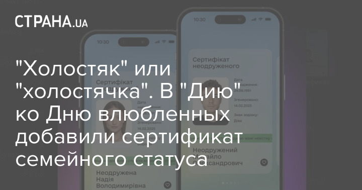 До додатку "Дія" додали сертифікат сімейного статусу, у тому числі холостяка та холостячки. Функцію було запроваджено до Дня закоханих.
