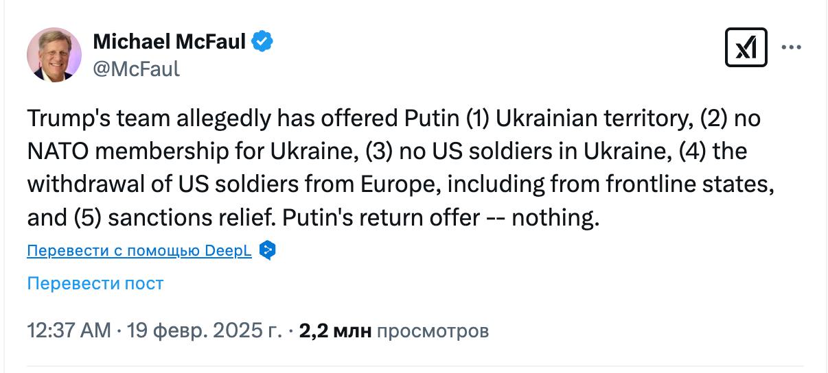 "Ймовірно, команда Трампа запропонувала Путіну українську територію, відмову від членства України в НАТО, відсутність американських солдатів в Україні, виведення американських солдатів з Європи, у тому числі з прифронтових держав, і зняття санкцій", - написав Макфол.