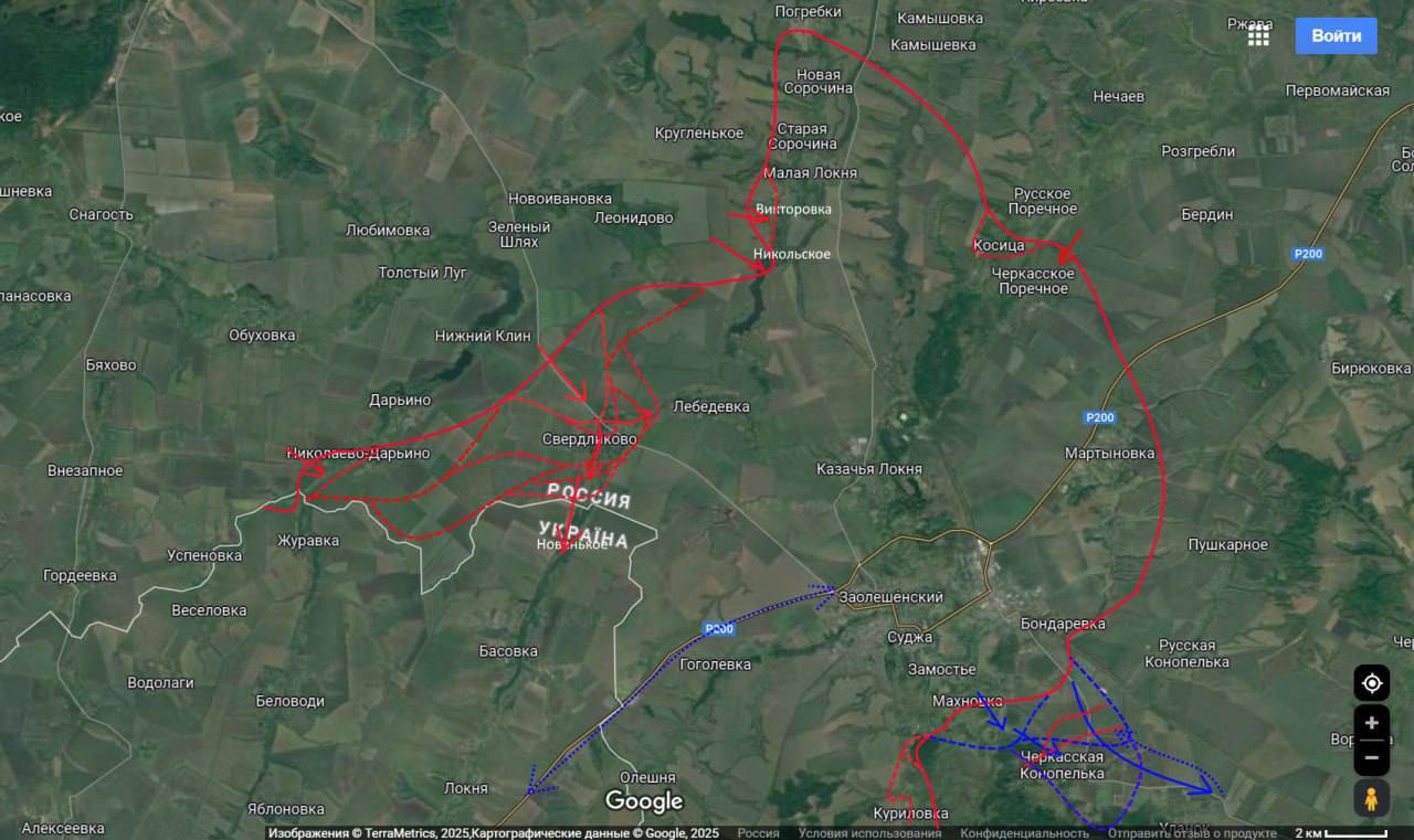 При цьому російські військові паблики стверджують, що війська РФ атакують від села Свердликіне (яке, як заявляло МО РФ, було днями повернуто під російський контроль) через кордон у напрямку сіл Новеньке та Басове в Сумській області з метою перерізати трасу на Суджу. Водночас, об'єктивних підтверджень просування російських військ на цьому напрямі на даний момент немає.