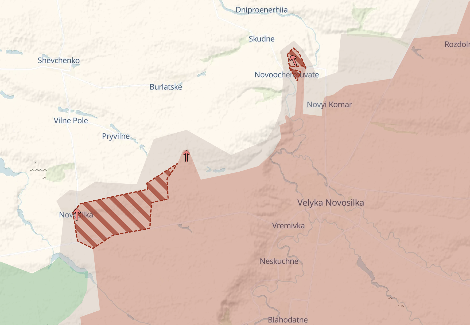 Триває настання РФ і з боку Великої Новосілки. На захід від неї росіяни захопили половину села Новосілка, розширили плацдарм на правому березі річки Мокрі Яли і просунулися на схід - у Новотлустуватий.