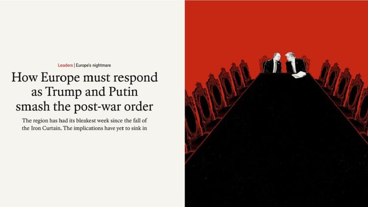 "Минулий тиждень був найпохмурішим у Європі з часів падіння "залізної завіси": Україну розпродують, Росію реабілітують, а за Дональда Трампа більше не можна розраховувати, що Америка прийде на допомогу Європі у воєнний час", - пише The Economist у редакційній статті "Гірший кошмар Європи".