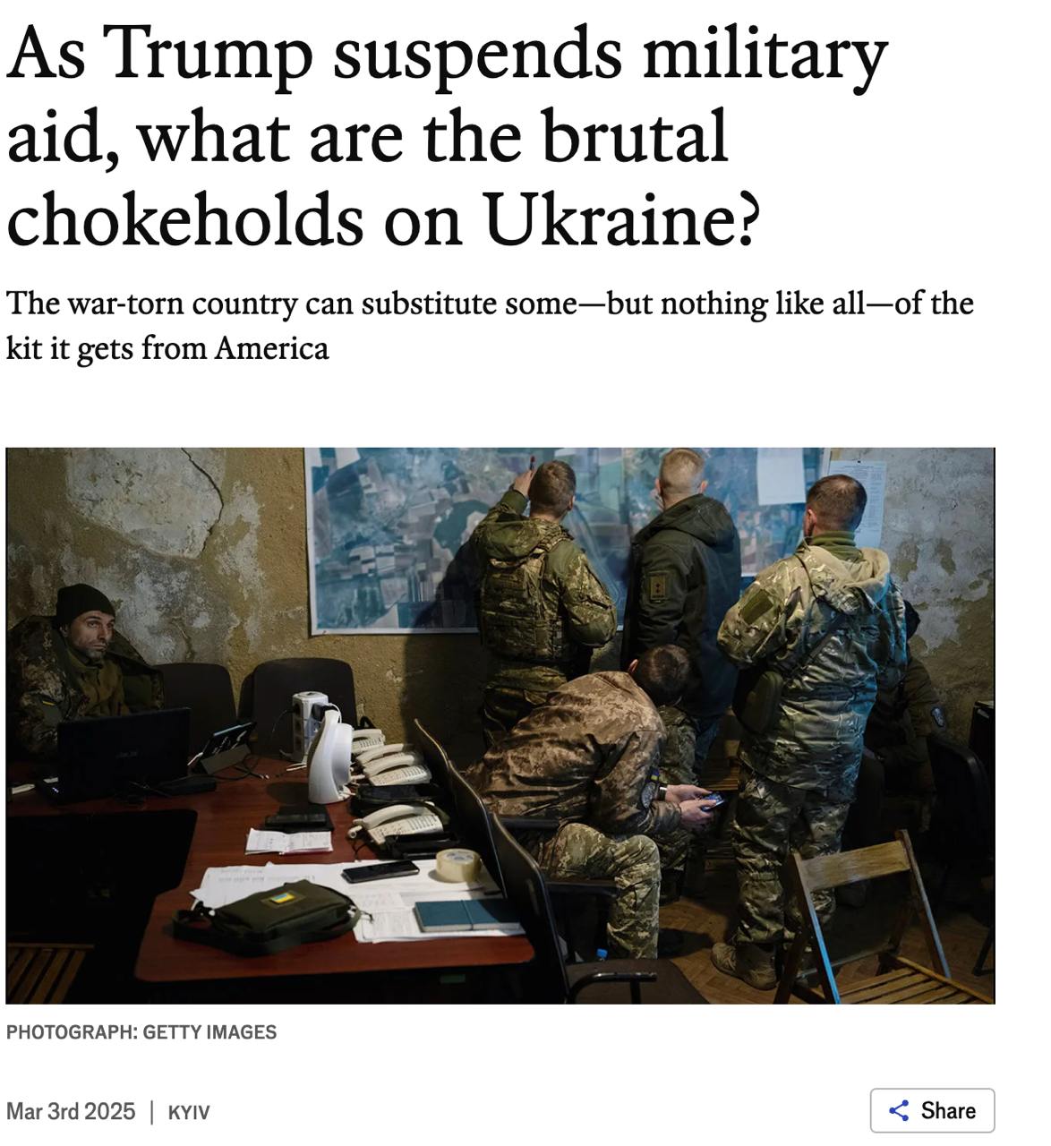 Про це пише у Х кореспондент The Economist Оллі Керролл із посиланням на джерела в Україні. Також українські чиновники заявили кореспондентові, що офіційно їм про припинення допомоги американці нічого не заявляли.