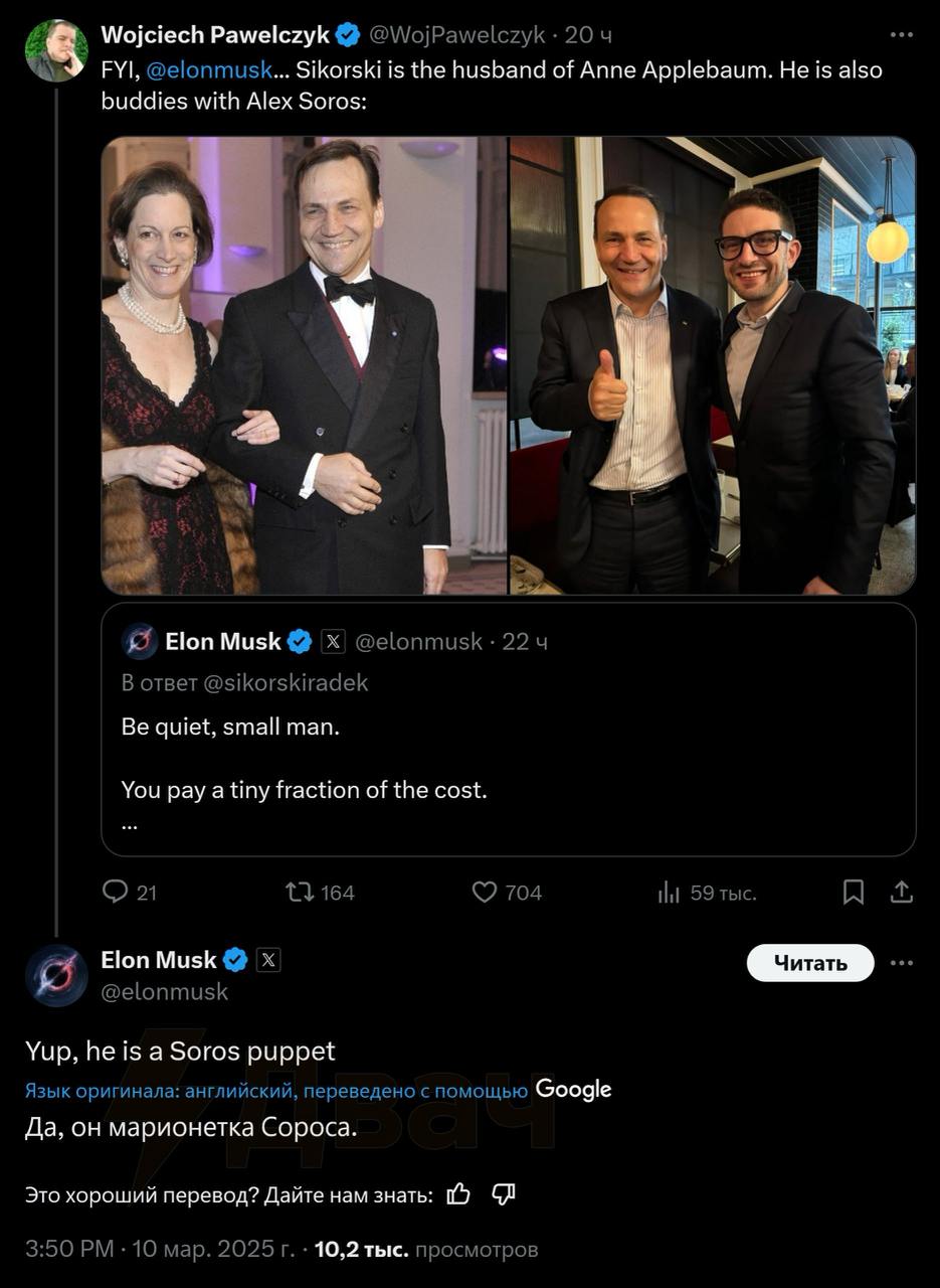 Американський мільярдер Ілон Маск назвав голову Міністерства закордонних справ Польщі Радослава Сікорського, з яким у нього раніше сталася суперечка в соцмережі, маріонеткою американського інвестора Олександра Сороса.