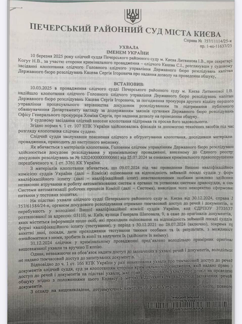 Раніше слідчі вже отримували тимчасовий доступ до документів, пов'язаних із тестуванням суддів у 2021–2024 роках, проте не змогли їх вилучити. Тому суд дав дозвіл на обшук, щоб виявити та вилучити документи та інші матеріали, які мають значення для розслідування.