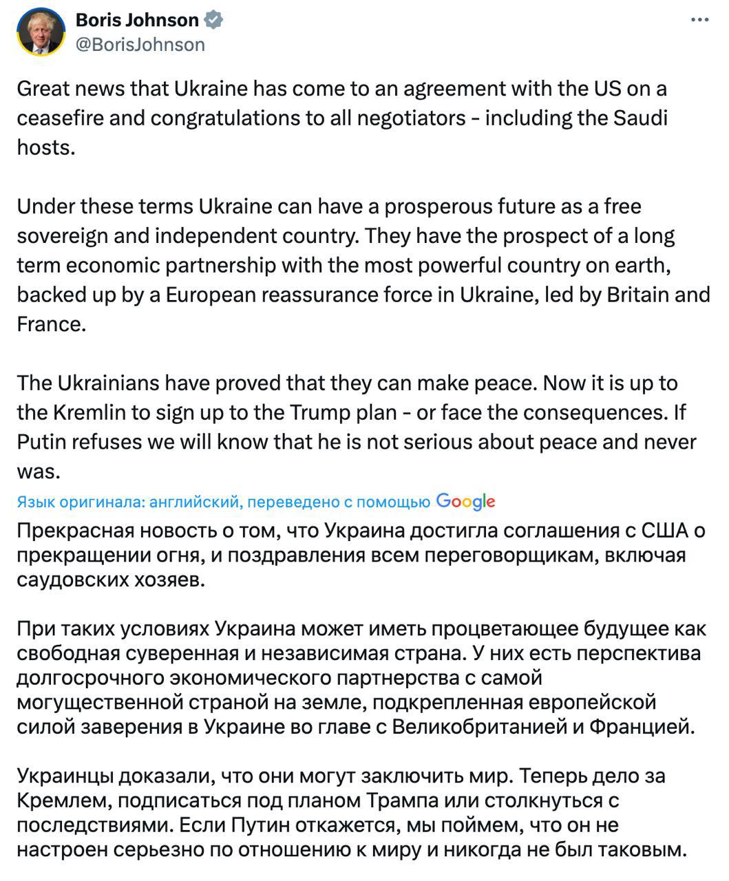 "Українці довели, що вони можуть укласти мир. Тепер справа за Кремлем, підписатися під планом Трампа або зіткнутися з наслідками. Якщо Путін відмовиться, ми зрозуміємо, що він не налаштований серйозно по відношенню до миру і ніколи не був таким", - заявив Джонсон.