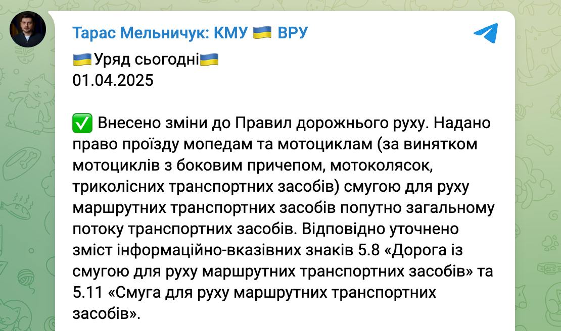 "Внесено зміни до правил дорожнього руху.  Надано право проїзду мопедам та мотоциклам (за винятком мотоциклів з боковим причепом, мотоколясок, триколісних транспортних засобів) смугою для руху маршрутних транспортних засобів попутно загальному потоку транспортних засобів. Відповідно уточнено зміст інформаційно-вказівних знаків 5.8 «Дорога із смугою для руху маршрутних транспортних засобів» та 5.11 «Смуга для руху маршрутних транспортних засобів»", - написав Мельничук.