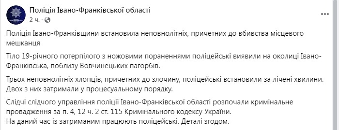 "Тіло 19-річного потерпілого з ножовими пораненнями поліцейські виявили на околиці Івано-Франківська, поблизу Вовчинецьких пагорбів. Трьох неповнолітніх хлопців, причетних до злочину, поліцейські встановили за лічені хвилини. Двох з них затримали у процесуальному порядку. Слідчі слідчого управління поліції Івано-Франківської області розпочали кримінальне провадження за п. 4, 12 ч. 2 ст. 115 Кримінального кодексу України. На даний час із затриманим працюють поліцейські", - йдеться у повідомленні.