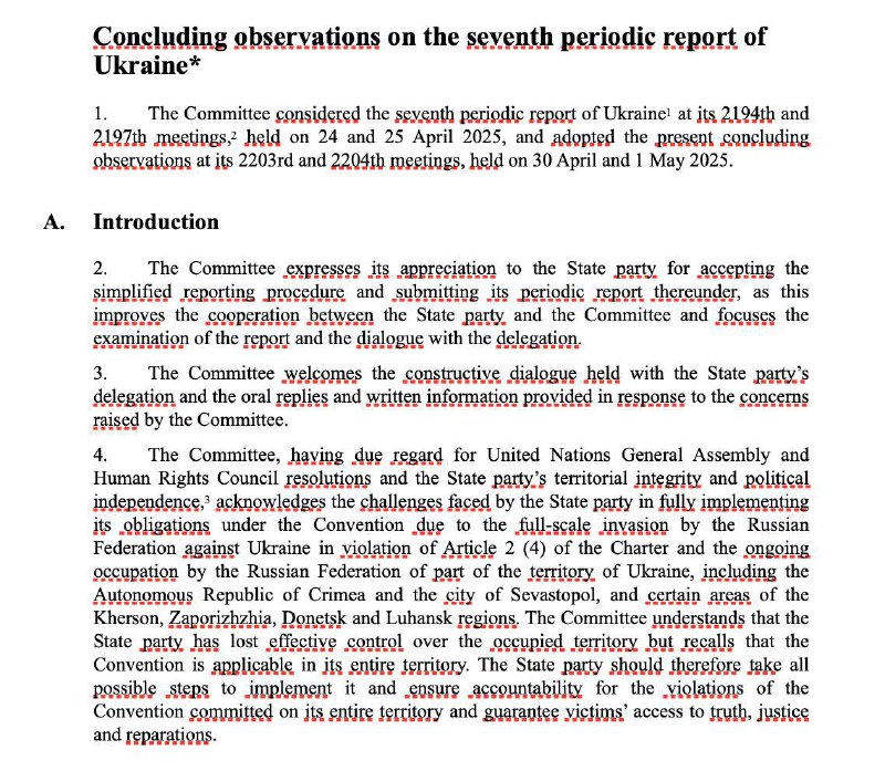 Хоча доповідь стосується здебільшого виконання Україною своїх зобов'язань щодо Конвенції проти катувань, Комітет ООН також підкреслює масштаби та систематичність порушень прав людини, які здійснюються Росією в Україні.