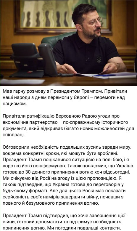 Зеленський заявив, що готовий до 30-денного перемир'я "хоч із сьогоднішнього дня", а також до переговорів у будь-якому форматі, проте лише після того, як Росія покаже "серйозність своїх намірів завершити війну, розпочавши з повного та безумовного припинення вогню".