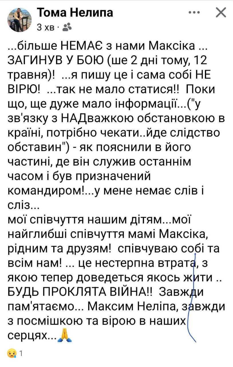 "Більше немає з нами Максіка. Загинув у бою. Я пишу це і сама собі не вірю. Так не мало статися. Поки що ще мало інформації. У зв'язку із надважкою обстановкою в країні треба чекати, йде слідство обставин", - написала вона.