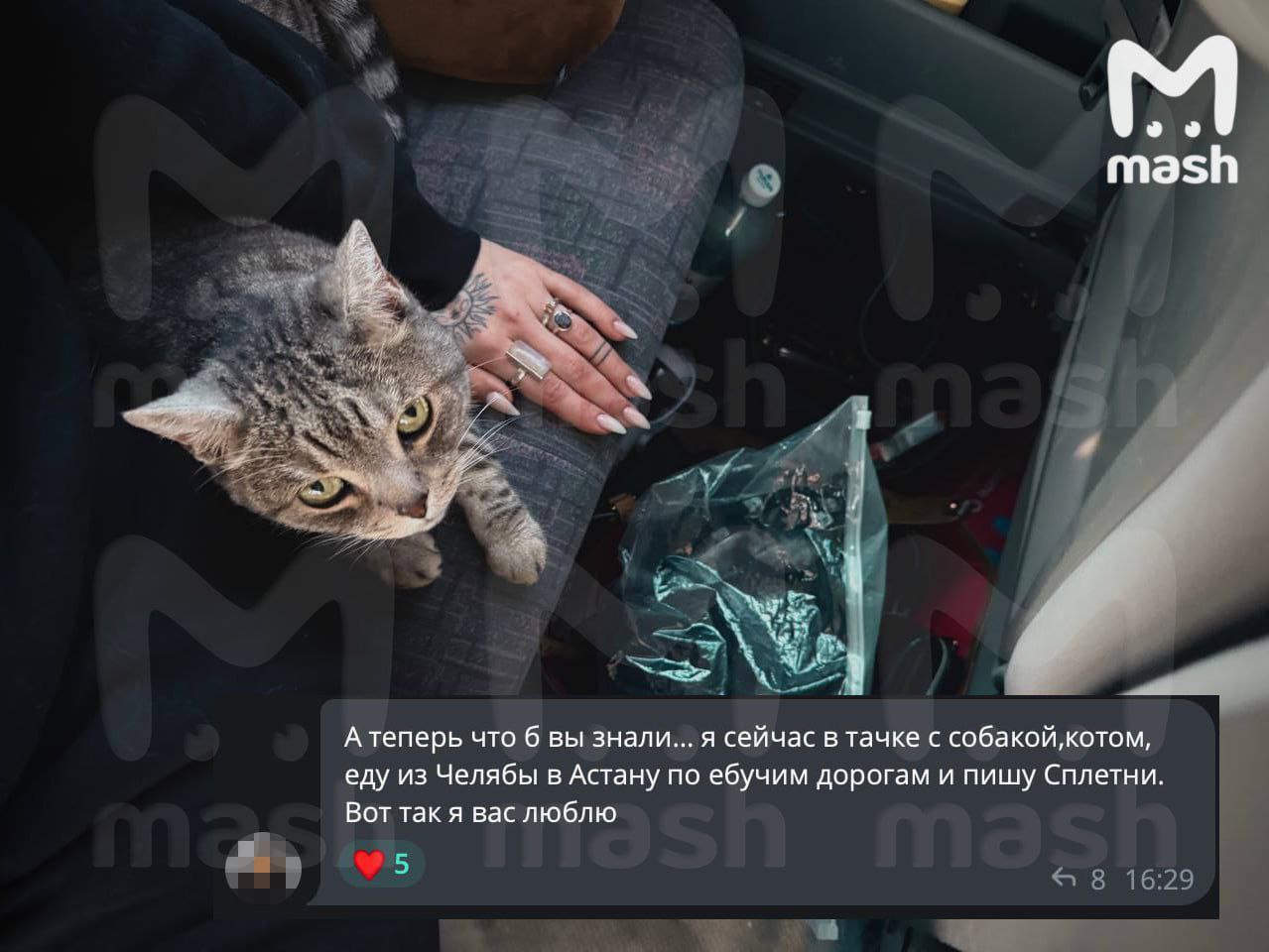 "А тепер щоб ви знали. Я зараз у тачці з собакою і котом, їду з Челяби (Челябінська - Ред.) в Астану е@учим дорогам і пишу плітки", - сказано в її публікації.