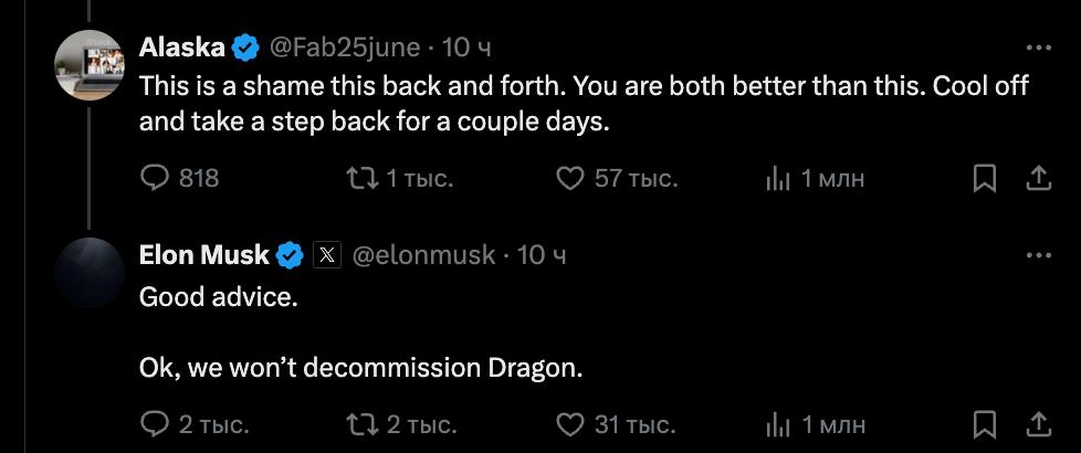 На пропозицію користувача Х "охолонути і зробити крок назад", мільярдер відповів: "Хороша порада. Ок, ми не виводитимемо Dragon з експлуатації".
