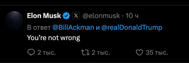 У схожому дусі він відповів мільярдеру Біллу Акману, союзнику Трампа та Маска, який сказав, що вони мають "укласти мир на благо нашої великої країни". На це Маск відповів: "Ви не помиляєтесь".