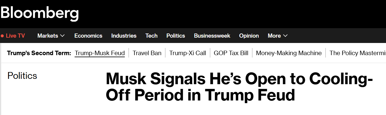 Bloomberg вважає, що Маск тим самим дає зрозуміти, що "прагне зменшити напругу у відносинах з президентом США" після того, як їх конфлікт учора перейшов у відкриту площину.
