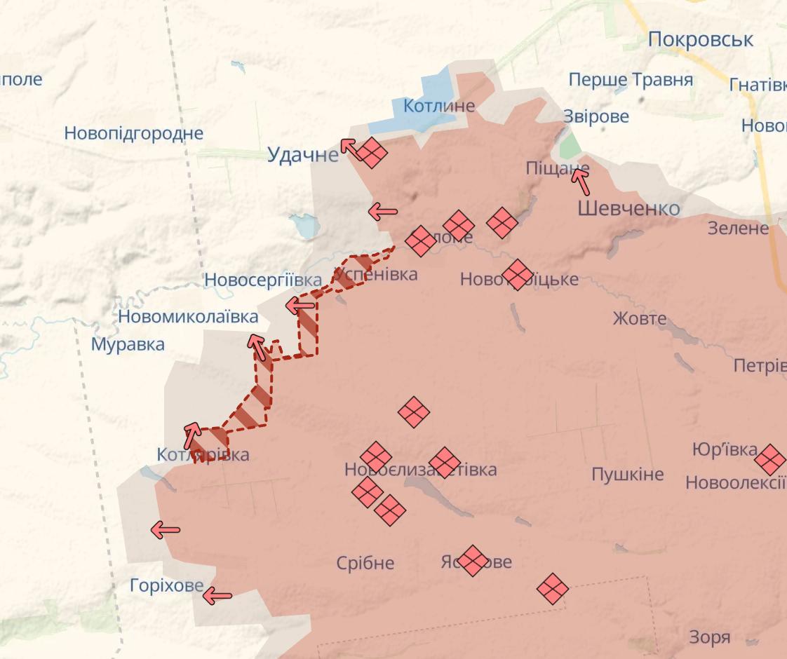 12.35 Армія РФ знову просунулась біля кордону з Дніпропетровською областю одразу на кількох ділянках від Успенівки до Котлярівки, свідчить карта Deep State.