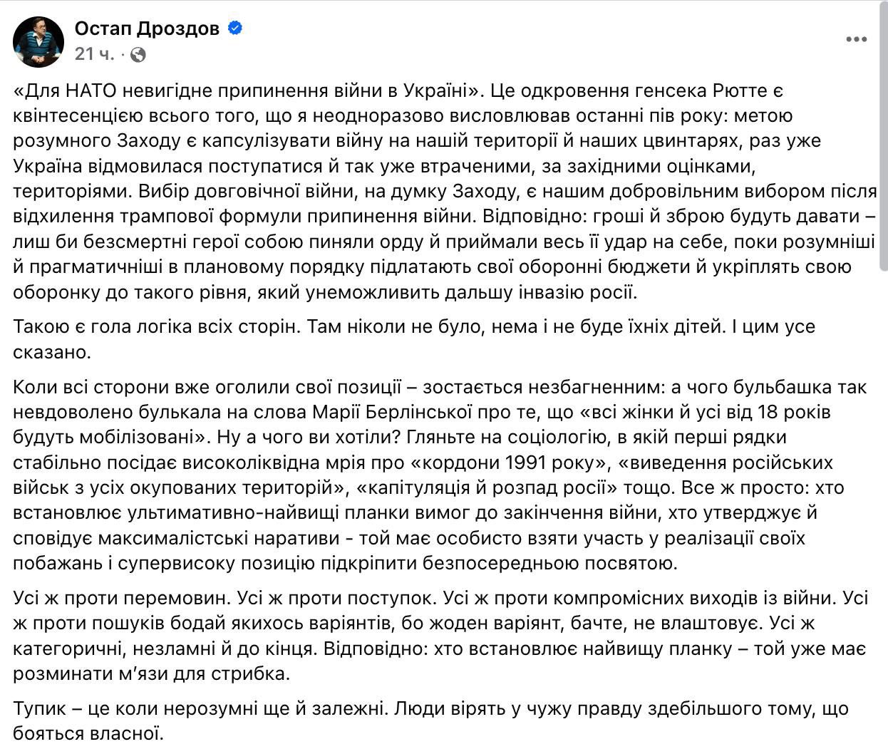 Про це написав у Фейсбуці журналіст Остап Дроздов, коментуючи заяву генсека НАТО Марка Рютте, де той дає зрозуміти, що країнам Альянсу невигідне завершення конфлікту.