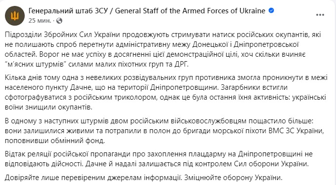 "Кілька днів тому одна з невеликих розвідувальних груп противника змогла проникнути у межі населеного пункту Дачне на території Дніпропетровщини. Загарбники встигли сфотографуватися з російським триколором, проте це була остання їхня активність: українські воїни знищили окупантів. Реляції російської пропаганди про захоплення плацдарму на Дніпропетровщині не відповідають дійсності. Дачне й надалі залишається під контролем Сил оборони України", - йдеться у публікації.
