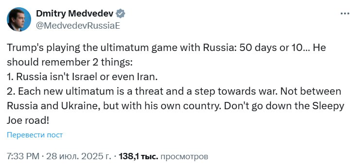 "Трамп грає в ультиматум з Росією: 50 днів або 10... Йому слід пам'ятати дві речі: 1. Росія – це не Ізраїль і навіть не Іран. 2. Кожен новий ультиматум – це загроза і крок до війни. Не між Росією та Україною, а з його власною країною. Не йдіть шляхом Сонного Джо", – написав Медведєв.