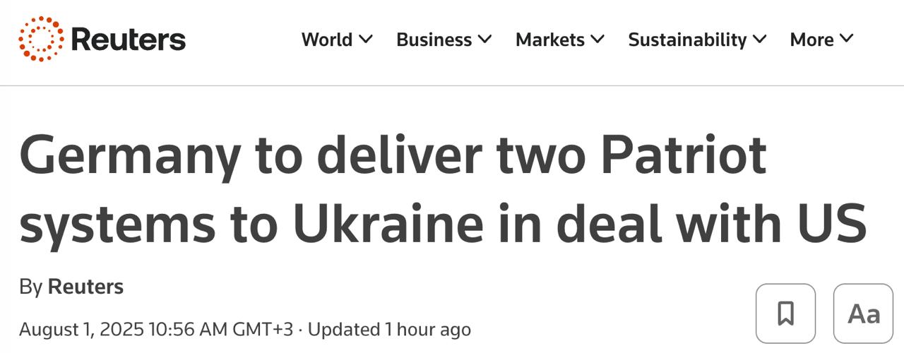 Німеччина вже "найближчими днями" передасть Україні нові пускові установки Patriot, а потім за два-три місяці - додаткові компоненти до них.