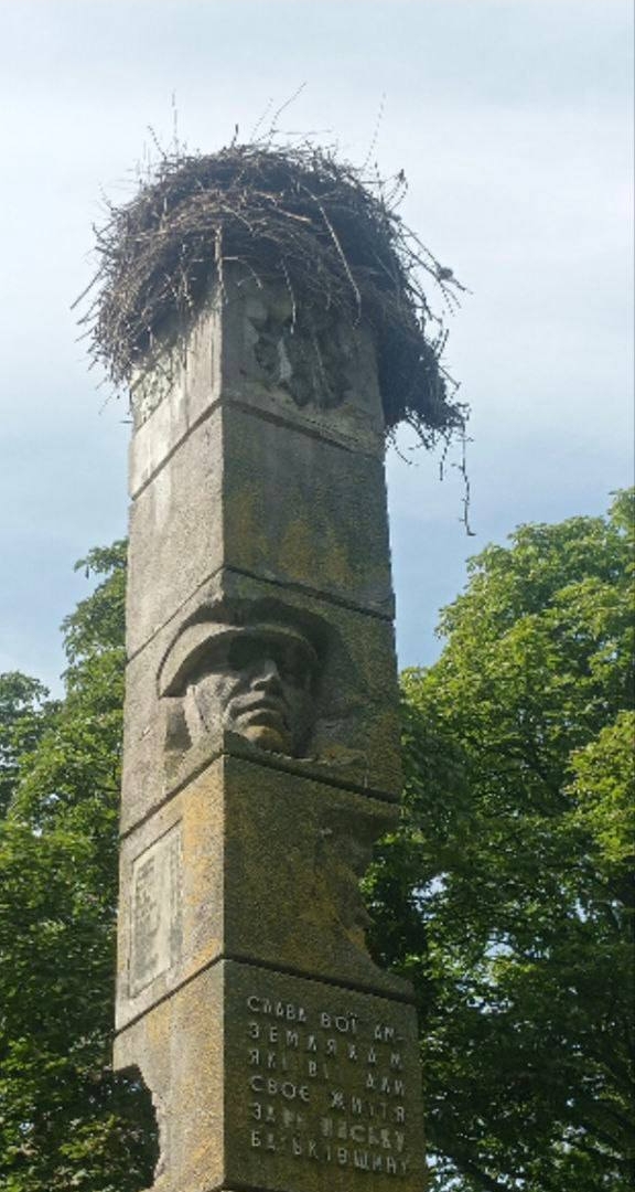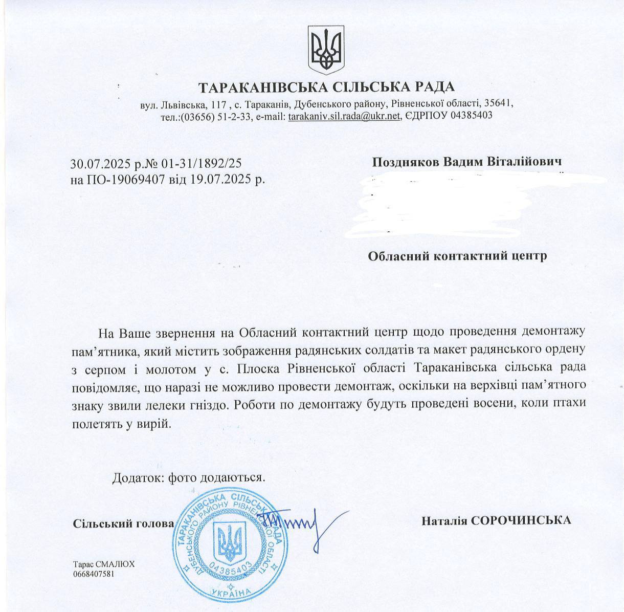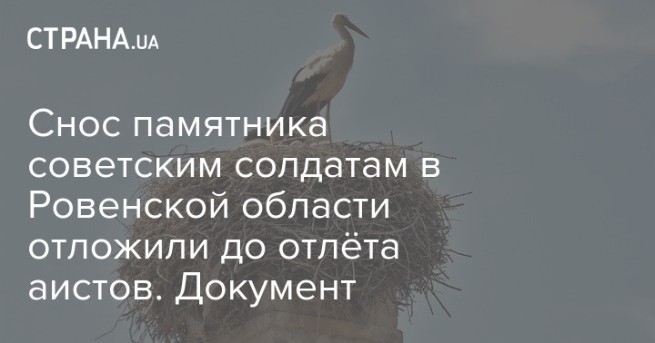 "За Вашим зверненням з проведення демонтажу пам'ятника, що містить зображення радянських солдатів і макет радянського ордену з серпом і молотом у с. Плоска Рівненської області Тараканівська сільська рада повідомляє, що поки неможливо провести демонтаж, оскільки на верхівці пам'ятного знака звили гніздо лелеки, роботи по демонтажу будуть проведені восени" сказано у документі.