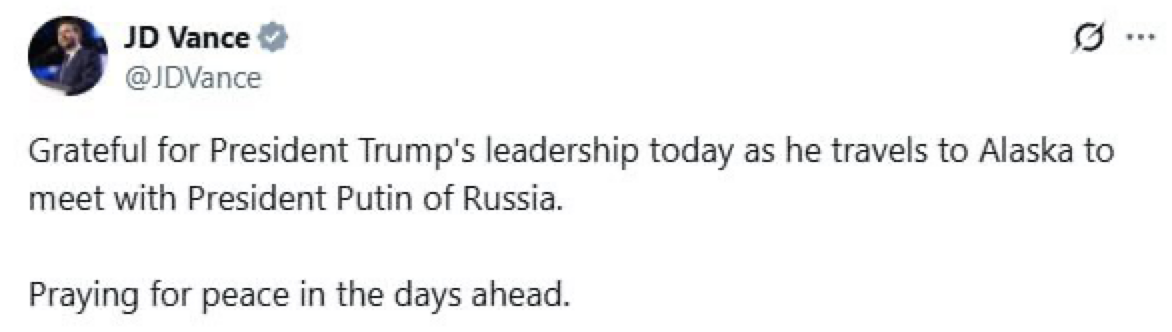 "Дякую за лідерство президента Трампа сьогодні, коли він вирушає на Аляску для зустрічі з президентом Путіним. Молимося про мир найближчими днями", - написав віце-президент США в Х.