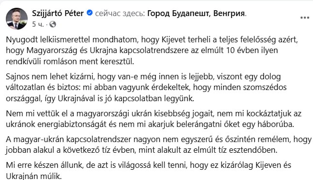 "З чистою совістю можу сказати, що Київ несе повну відповідальність за те, що система відносин Угорщини та України за останні 10 років пережила таке надзвичайне погіршення... Не ми відбирали права української меншини в Угорщині, не ми ставили під загрозу енергетичну безпеку українців і не ми хотіли втягнути їх у війну", - написав.