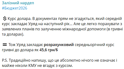 "У документах прямо не згадується, який середній курс закладає уряд наступного року... Але це легко порахувати із заявлених планів щодо залучення міжнародної допомоги (у гривні та доларах). Уряд закладає середньорічний курс гривні до долара як 45,6 грн/$", – написав Железняк.