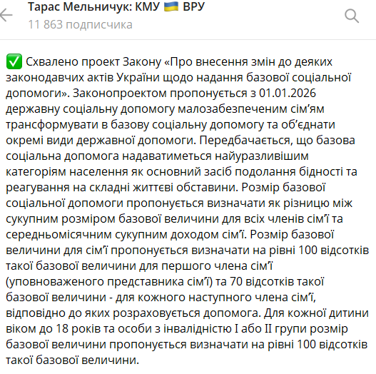 Кабінет міністрів України хоче запровадити з 1 січня 2026 року замість різних соціальних виплат єдину базову соцдопомогу.