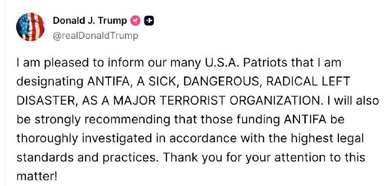 "Я радий повідомити нашим численним патріотам США, що я призначаю Антифа - хвору, небезпечну, радикально ліву катастрофу - великою терористичною організацією. Я також наполегливо рекомендуватиму ретельно розслідувати джерела фінансування Антифа відповідно до вищих правових стандартів і практик", - написав американський президент.