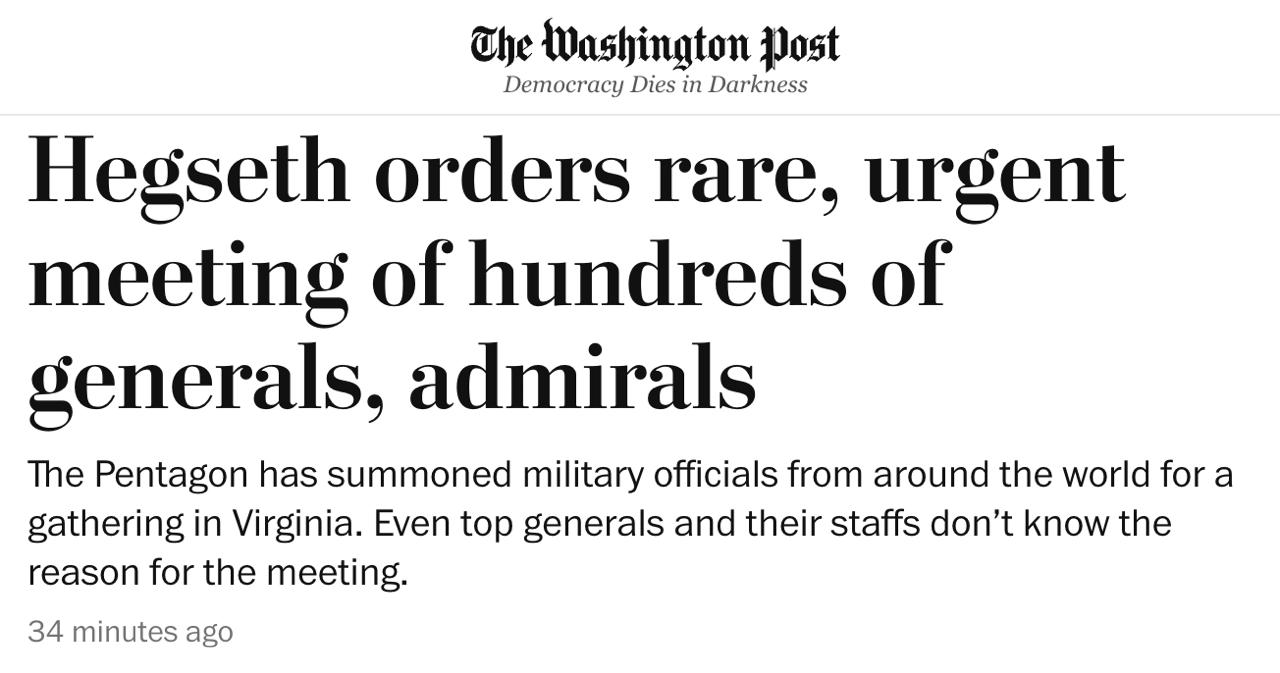 Міністр оборони США Піт Хегсет наказав сотням американських генералів та адміралів з усього світу терміново зібратися у Вірджинії наступного тижня. Причини він при цьому не вказав.