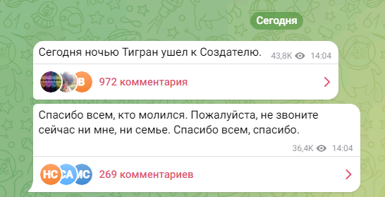 "Сьогодні вночі Тігран пішов до Творця. Дякую всім, хто молився. Будь ласка, не дзвоніть зараз ні мені, ні родині", - написала Симоньян.