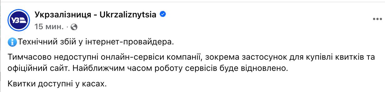 "Тимчасово недоступні онлайн-сервіси компанії, включаючи додаток купівлі квитків та офіційний сайт. Найближчим часом послуги будуть відновлені", - йдеться у повідомленні.