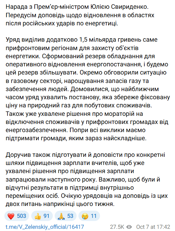 "Уряд виділив додатково 1,5 мільярда гривень саме прифронтовим регіонам для захисту об'єктів енергетики. Сформовано резерв обладнання для оперативного відновлення енергопостачання і будемо цей резерв збільшувати. Домовилися, що найближчим часом уряд прийме постанову, що зберегла фіксовану ціну на природний газ для побутових споживачів. Також вже ухвалено рішення про мораторій на відключення споживачів у прифронтових громадах від енергозабезпечення", - повідомляє президент.