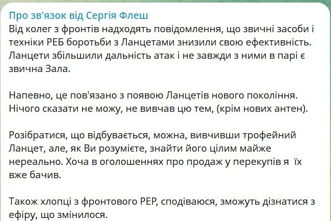18.30 Звичні кошти РЕБ знизили свою ефективність у боротьбі з російськими "Ланцетами", повідомляє експерт із дронів та зв'язку Сергій Бескрестнов ("Флеш") з посиланням на колег з фронту.