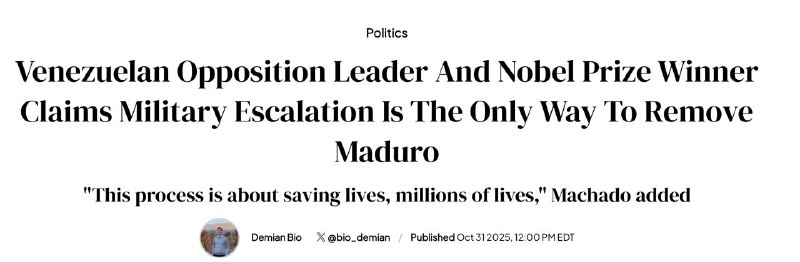 Лауреат Нобелівської премії миру цього року венесуельська опозиціонерка Марія Коріна Мачадо закликала президента США Дональда Трампа до "військової ескалації", оскільки вважає це єдиним способом повалити президента Ніколаса Мадуро.