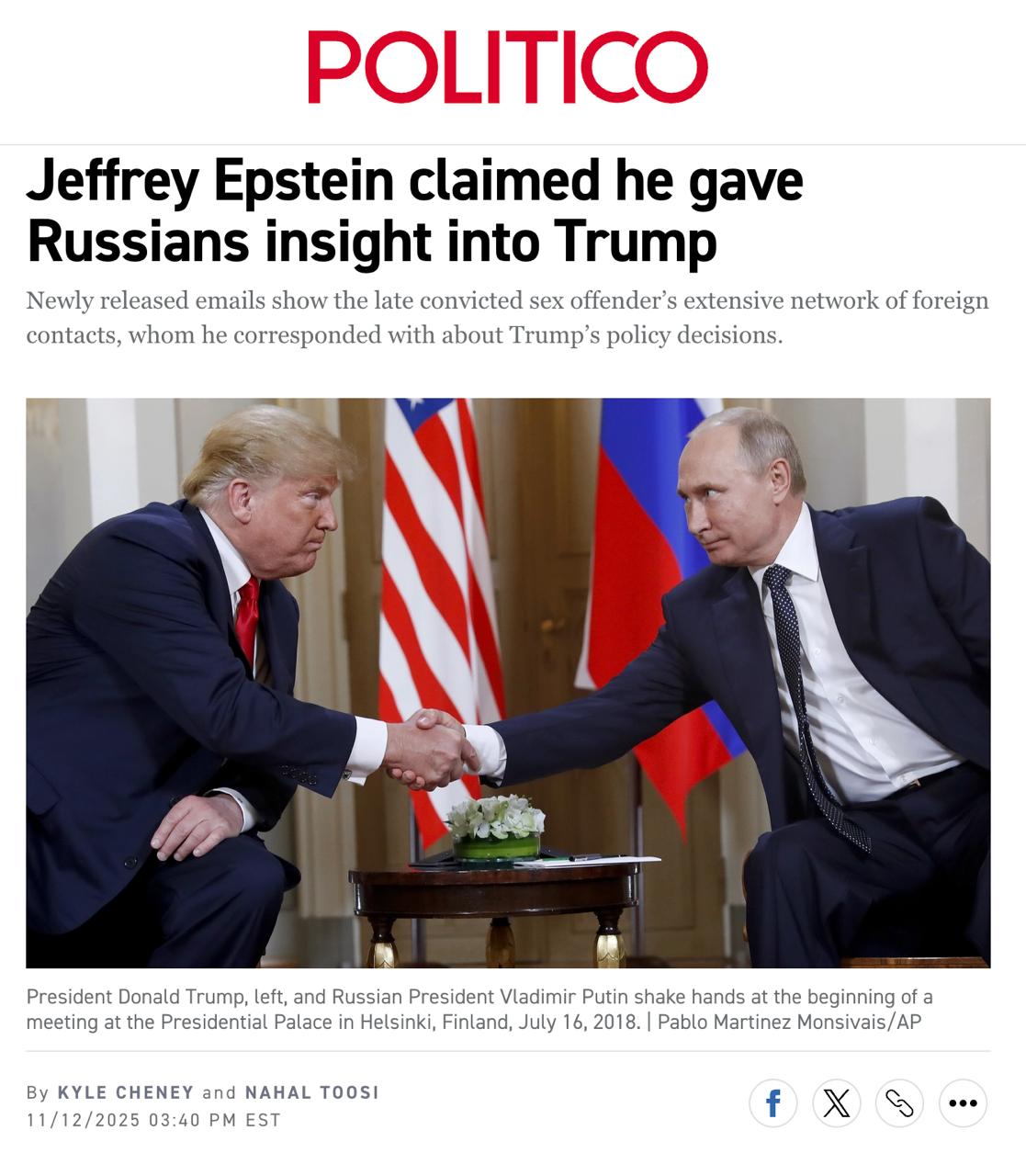За інформацією видання, Епштейн у 2018 році, за місяць до зустрічі Трампа та Володимира Путіна, намагався передати Росії через главу МЗС ДРФ Сергія Лаврова інформацію про президента США.