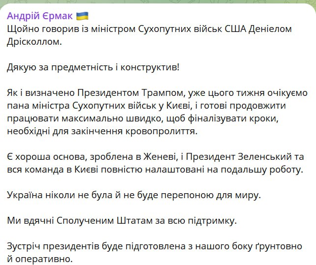 "Як і визначено президентом Трампом, вже цього тижня очікуємо на пана міністра Сухопутних військ у Києві і готові продовжити роботу максимально швидко, щоб фіналізувати кроки, необхідні для закінчення кровопролиття", - написав Єрмак.