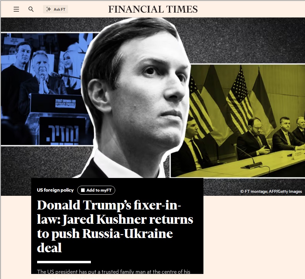 Білий дім почав активно залучати до переговорів про Україну зятя президента США Дональда Трампа Джареда Кушнера, і він незабаром може замінити спецпредставника Стівена Віткоффа.