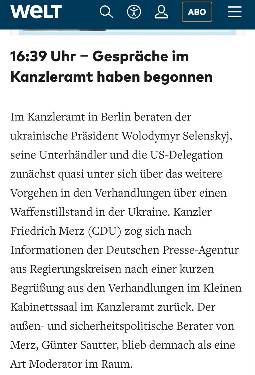 На зустрічі також був канцлер ФРН Фрідріх Мерц. Він посідав місце за столом на боці української делегації, проте, за даними газети Die Welt, достроково залишив переговори.