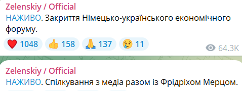 Тим часом, виходячи з повідомлень в офіційному телеграм-каналі Зеленського, президент України разом із канцлером ФРН Фрідріхом Мерцем спілкується із пресою на закриття німецько-українського економічного форуму.